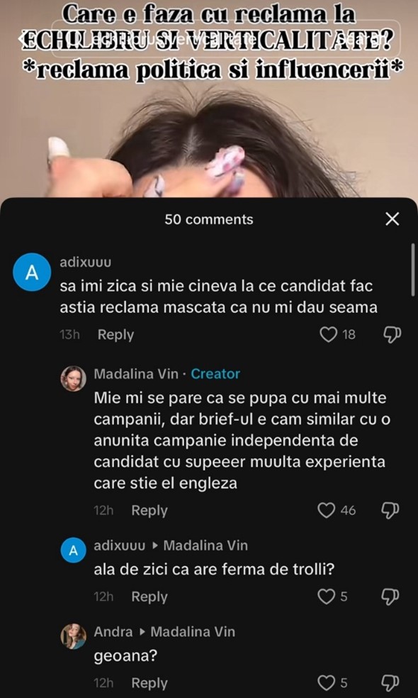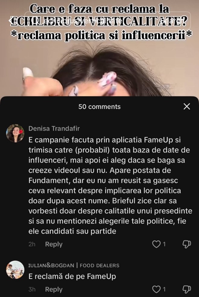 Videoclipurile sunt însoțite de hashtag-urile #EchilibrușiVerticalitate, #Prezidențiale2024, #UnLiderPotrivitPentruMine și majoritatea nu sunt marcate ca fiind reclame plătite. În comentariile unui videoclip de pe TikTok, o persoană – cel mai probabil influencer – a semnalat faptul că acțiunea este o campanie făcută prin aplicația FameUp.