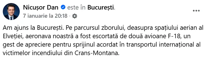 În urmă cu aproape o săptămână, președintele Nicușor Dan însă, a prezentat episodul diferit și a sugerat că escorta ar fi fost un gest de apreciere oferit unilateral de Elveția pentru sprijinul acordat în transportul internațional al victimelor incendiului din Crans-Montana.
