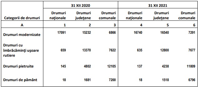 Din lungimea totală a drumurilor naţionale, 6197 km (35,4%) erau drumuri europene, 931 km (5,3%) autostrăzi, iar din punctul de vedere al numărului de benzi de circulaţie, 1978 km (11,3%) erau drumuri cu 4 benzi, 297 km (1,7%) drumuri cu 3 benzi şi 36 km (0,2%) drumuri cu 6 benzi. Lungimea drumurilor judeţene cuprindea în proporţie de 47,1% drumuri modernizate şi 35,2% dintre drumurile comunale erau drumuri pietruite”, potrivit unui comunicat al Institutului Naţional de Statistică publicat joi.
