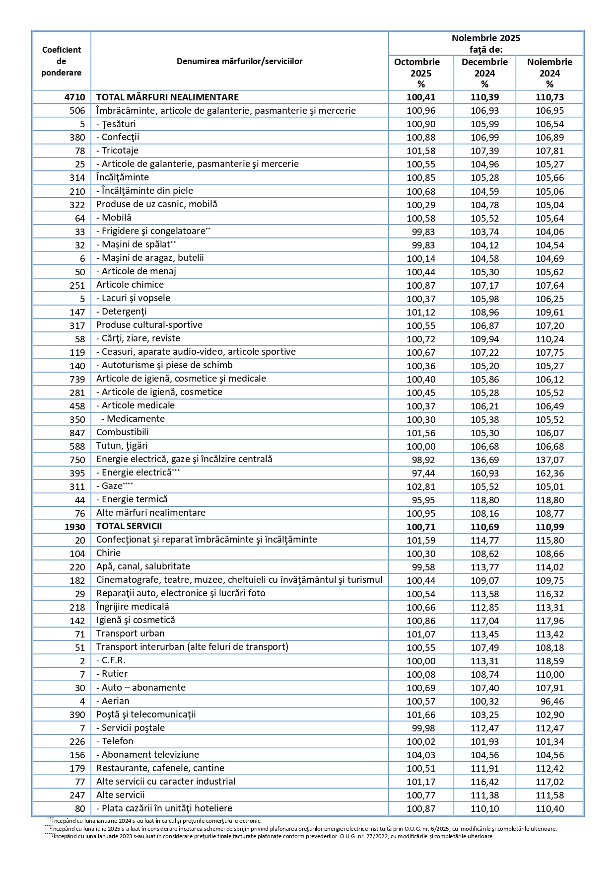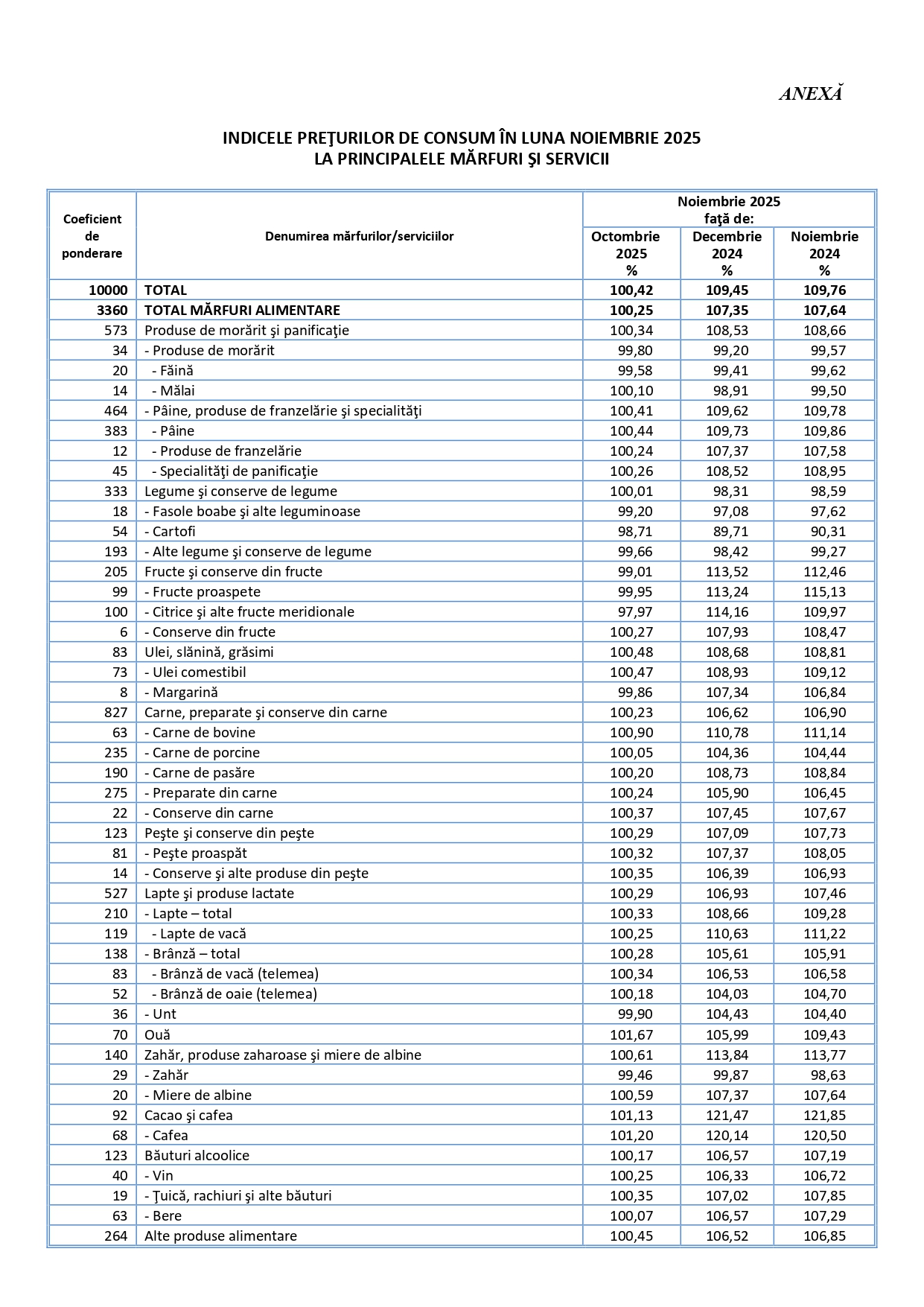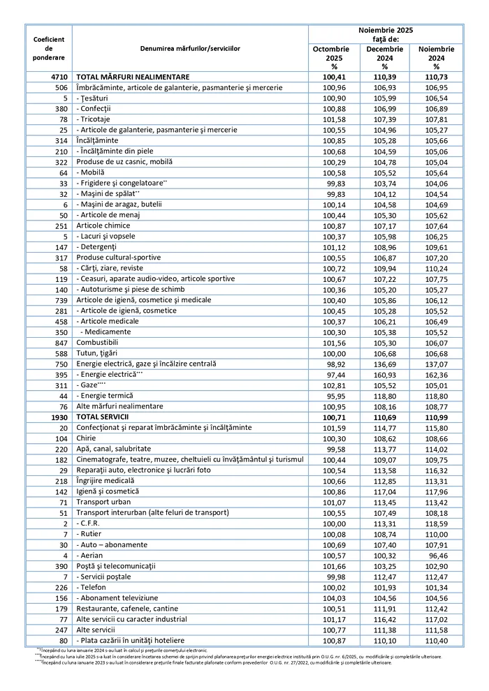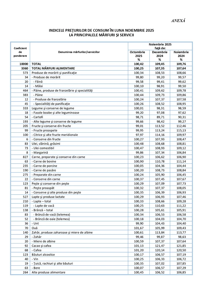 „Indicele prețurilor de consum în luna noiembrie 2025 comparativ cu luna octombrie 2025 a fost 100,42%. Rata inflației de la începutul anului (noiembrie 2025 comparativ cu decembrie 2024) a fost 9,5%. Rata anuală a inflației în luna noiembrie 2025 comparativ cu luna noiembrie 2024 a fost 9,8%. Rata medie a modificării prețurilor de consum în ultimele 12 luni (decembrie 2024 – noiembrie 2025) față de precedentele 12 luni (decembrie 2023 – noiembrie 2024) a fost 6,9%”, se arată în comunicatul INS.