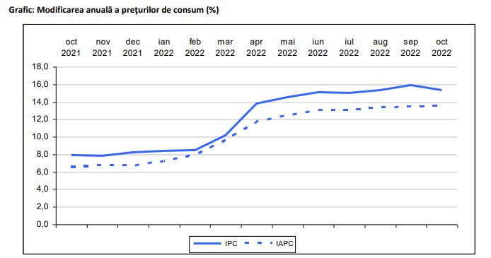 Rata medie a modificării preţurilor de consum în ultimele 12 luni (noiembrie 2021 – octombrie 2022) faţă de precedentele 12 luni (noiembrie 2020 – octombrie 2021) determinată pe baza IAPC este 10,8%.