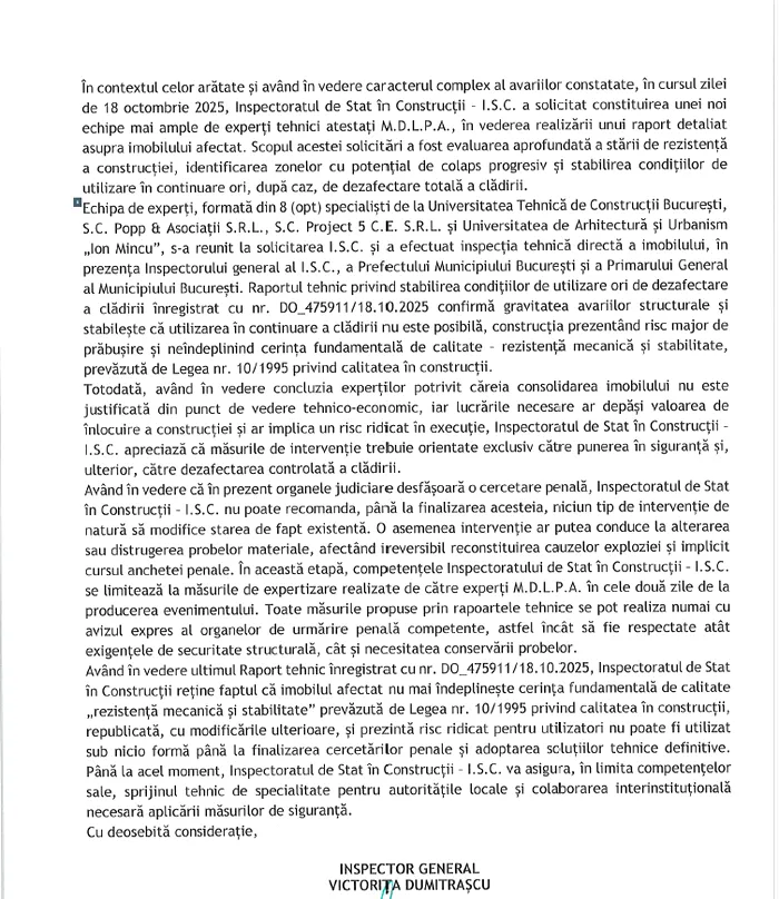 - Având în vedere că în prezent organele judiciare desfășoară o cercetare penală, Inspectoratul de Stat în Construcţii I.S.C. nu poate recomanda, până la finalizarea acesteia, niciun tip de intervenţie de natură să modifice starea de fapt existentă. O asemenea intervenţie ar putea conduce la alterarea sau distrugerea probelor materiale, afectând ireversibil reconstituirea cauzelor exploziei și implicit cursul anchetei penale.