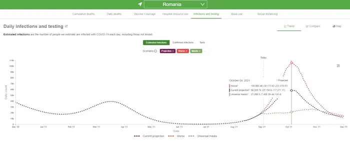 Trei scenarii folosesc cercetătorii IHME: cel mai pesimist (n.r. – worst)- în care nimeni nu mai poartă măști, cel opimist (n.r. – universal masks) – în care 95% din populație poartă măști și proiecția curentă (current projection – nr.) – în care oamenii poartă măști ca și până acum, dar mobilitatea crește odată cu vaccinarea. Astfel, în cel mai rău caz, România ar putea avea,pe data de 4 octombrie, 100.000 de infectări pe zi. dacă toți românii ar purta măști, la data menționată numărul infectărilor ar ajunge la 20.000 pe zi. În scenariul curent (current projection – n.r.) numărul invectărilor ar putea depăți 50.000 pe zi.