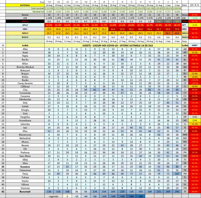 Cercetătorul ilustrează cu un tabel felul în care a crescut numărul deinfectări în fiecare județ în perioada 19 august – 2 septembrie.