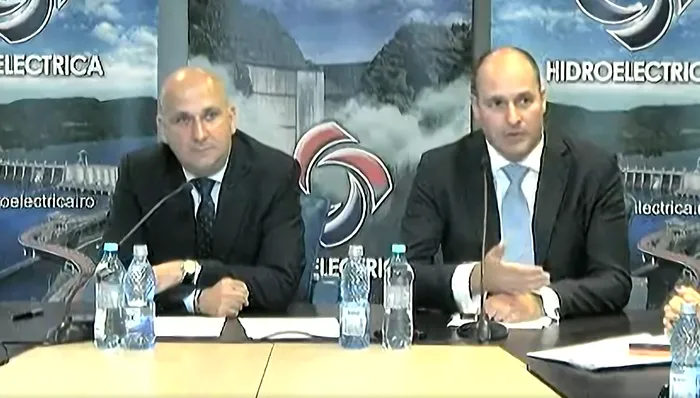 Preşedintele directoratului Hidroelectrica, Bogdan Badea (stânga) și directorul general al Franklin Templeton România – administratorul Fondului Proprietatea – Johan Meyer/ Captură video