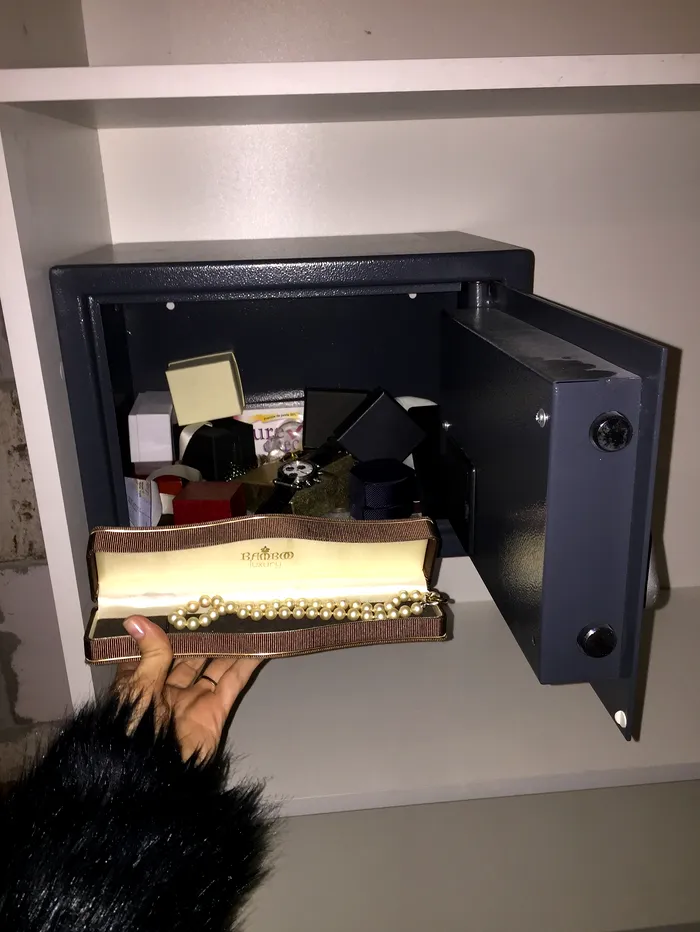 Intr-una din bucatile din dressingul nostru statea smirna, infrigurat si speriat… seiful nostru plin cu tot ce agonisisem pana atunci. Niste inele de aur, niste bijuterii cu diamante, un ceas scumpitel, ca chiar si inelul de logodna de la sot. Chair si siragul din perle naturale pe care ma pregateam sa i-l ofer cadou mamei. In garaj!!