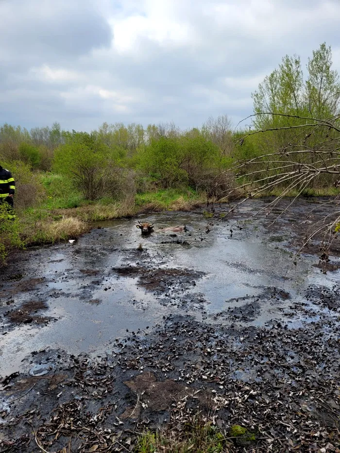 Salvatorii giurgiuveni au fost solicitați pentru o intervenție mai puțin obișnuită. Animalul, de aproximativ 400 de kg, a fost salvat, în urmă cu puțin de pompieri după ce a căzut într-o groapă plină cu apă și păcură. Acțiunea s-a desfășurat pe un teren viran din apropierea adăpostului de câini din oraș.