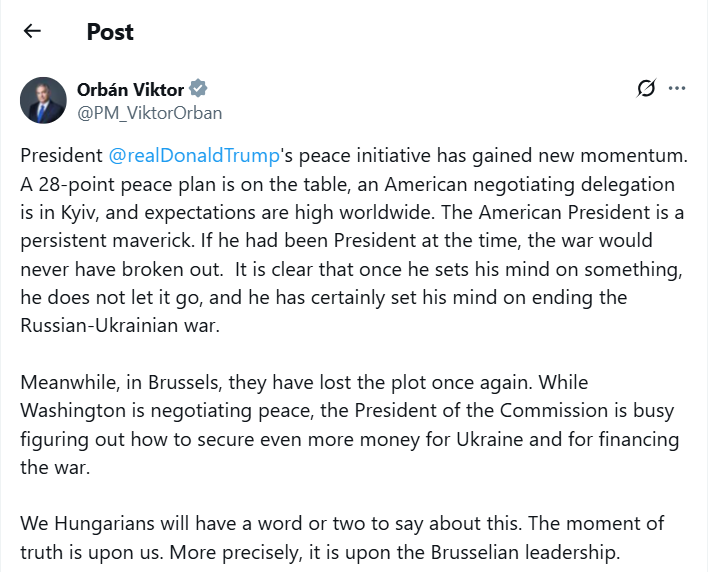 „Acum este unul dintre cele mai dificile momente din istoria noastră. Presiunea asupra Ucrainei este acum una dintre cele mai grele. Ucraina se poate afla acum în fața unei alegeri foarte dificile. Fie pierderea demnității, fie riscul de a pierde un partener cheie. Fie 28 de puncte dificile, fie o iarnă extrem de grea – cea mai grea – și riscuri. Viața fără libertate, fără demnitate, fără justiție. Și să credem pe cineva care a atacat deja de două ori.”, a declarat președintele în discursul său de zece minute.