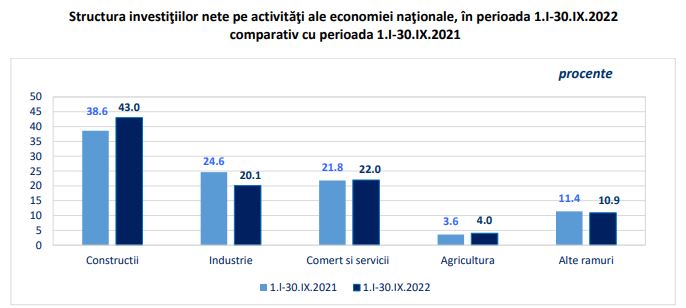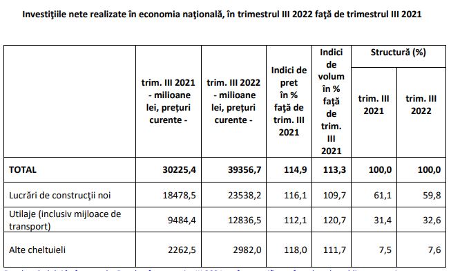 În perioada 1 ianuarie – 30 septembrie 2022, comparativ cu perioada similară din anul 2021, investiţiile nete realizate în economia naţională au crescut cu 4,5%, creştere înregistrată la elementele de structură lucrări de construcţii noi cu 5,5% şi la utilaje (inclusiv mijloace de transport) cu 4,9%.