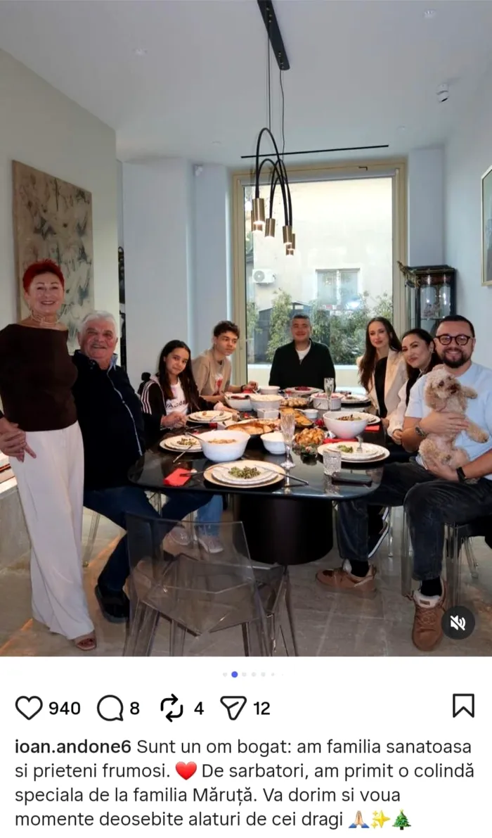 „Sunt un om bogat: am familia sănătoasă și prieteni frumoși. De sărbători, am primit o colindă specială de la familia Măruță. Vă dorim și vouă momente deosebite alături de cei dragi”, a scris Ioan Andone, pe pagina sa de Instagram.
