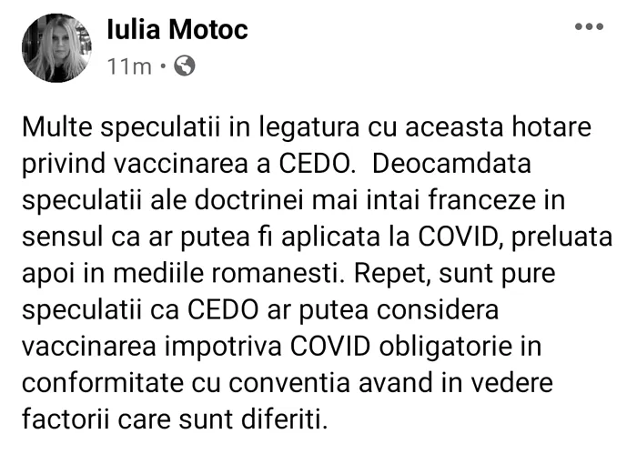 „Multe speculații în legătură cu această hotărâre privind vaccinarea a CEDO. Deocamdată speculaţii ale doctrinei mai întâi franceze în sensul că ar putea fi aplicată la COVID, preluata apoi în mediile romaneşti. Repet, sunt pure speculaţii ca CEDO ar putea considera vaccinarea împotriva COVID obligatorie în conformitate cu convenţia având în vedere factorii care sunt diferiţi”, scrie Iulia Motoc pe Facebook.