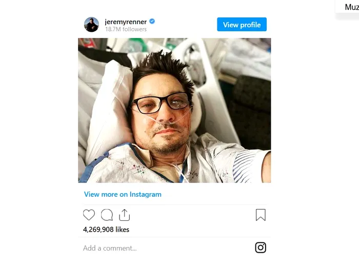 Celebrul actor Jeremy Renner a postat un selfie de pe patul de spital din Nevada, unde primește îngrijiri medicale, după un accident suferit în timp ce curăța zăpada acasă.