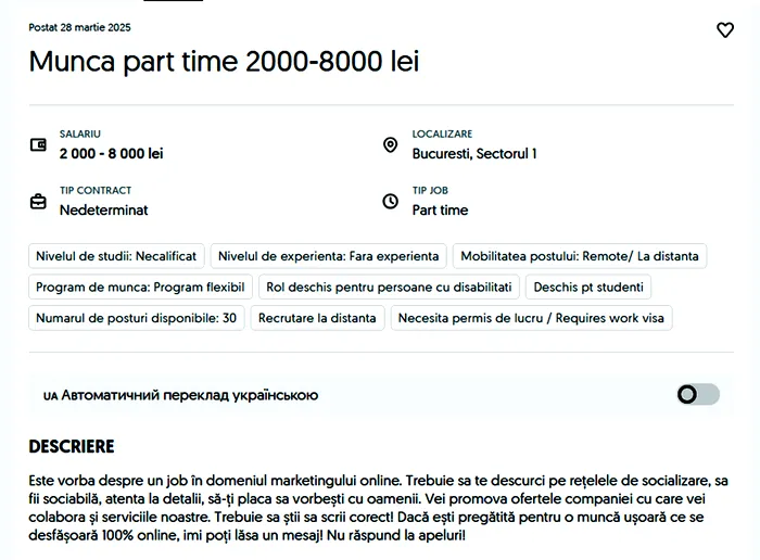 În România încep să se înmulțească job-urile care sunt plătite cu mai mult de 1000 de euro pe lună. Pe platforma OLX a fost publicat un anunț de recrutare pentru „domeniul marketingului obline”.