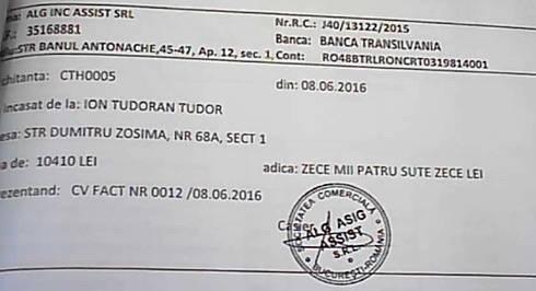 Tudor Ion-Tudoran s-a dus în fața instanței cu o factură de peste 10.000 de lei pentru a justifica o parte din daune. Factura era emisă de ALG Inc Assist SRL, iar plata era făcută în numerar, după cum reiese din chitanța depusă la dosar.