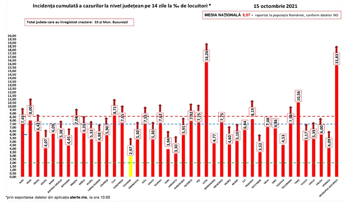 Coeficientul infectărilor cumulate la 14 zile, raportate la 1.000 de locuitori, este calculat de către Direcțiile de Sănătate Publică, la nivelul Municipiului București și al județelor: