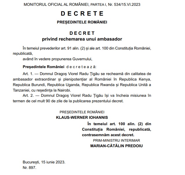 Conform legii, Dragoș Viorel Radu Țigău are răgaz să își încheie misiunea în Nairobi în termen de cel mult 90 de zile de la publicarea decretului de rechemare.
