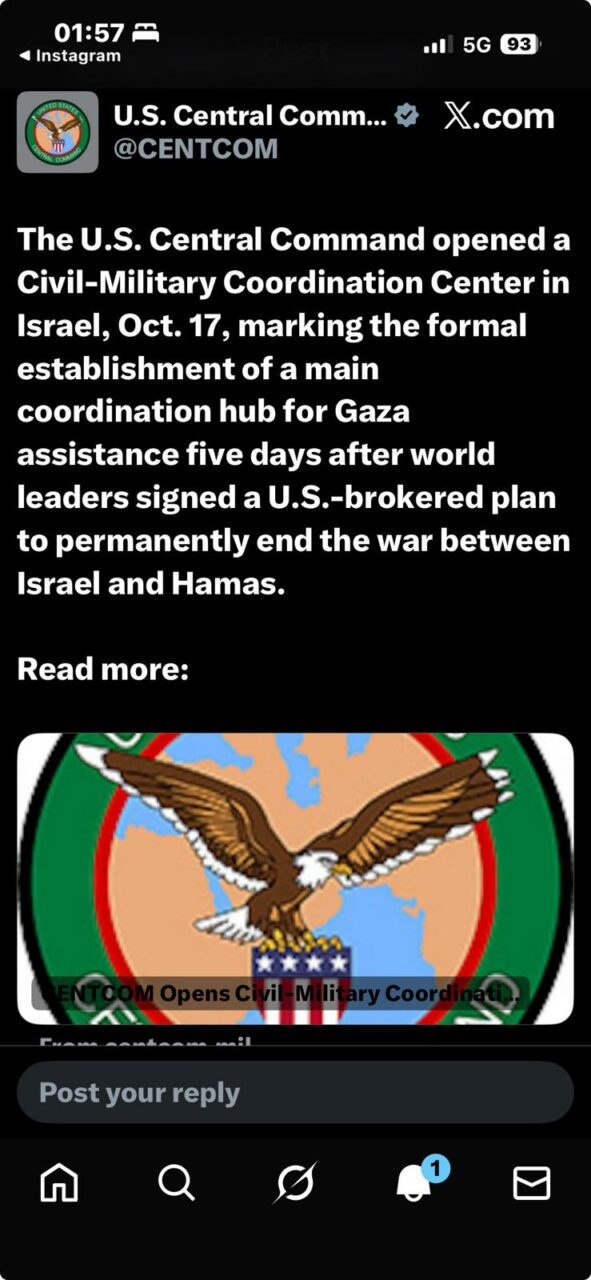 Într-o postare publicată pe X pe 21 octombrie, Comandamentul Central al SUA (CENTCOM) a anunțat deschiderea unui Centru de Coordonare Civil-Militară în Israel pe 17 octombrie, marcând stabilirea unui punct central de coordonare pentru asistență acordată Fâșiei Gaza, la cinci zile după ce liderii lumii au semnat planul mediat de SUA pentru încheierea permanentă a războiului dintre Israel și Hamas.