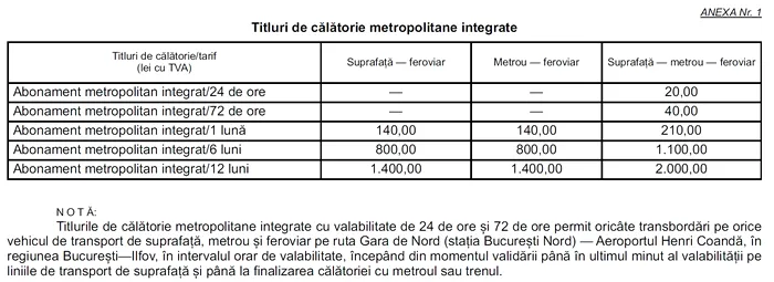 „Titlurile de călătorie metropolitane integrate cu valabilitate de 24 de ore şi 72 de ore permit oricâte transbordări pe orice vehicul de transport de suprafaţă, metrou şi feroviar pe ruta Gara de Nord (staţia Bucureşti Nord) – Aeroportul Henri Coandă, în regiunea Bucureşti-Ilfov, în intervalul orar de valabilitate, începând din momentul validării până în ultimul minut al valabilităţii pe liniile de transport de suprafaţă şi până la finalizarea călătoriei cu metroul sau trenul”, se arată în ordin.