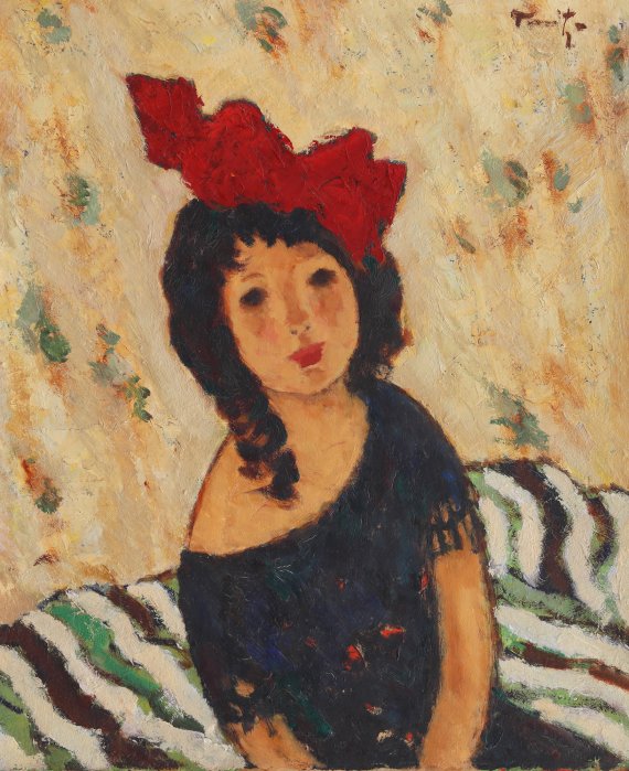 ”Fundița roșie” – ulei pe carton 57 x 47.5 cm semnat dreapta sus, cu brun, ”Tonitza” -, aparținând pictorului Nicolae Tonitza (supranumit și ”interpret al tristeților luxuriant colorate”), a fost estimat la 80.000 – 120.000 de euro și a fost adjudecat pentru suma de 80.000 de euro.