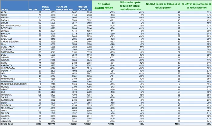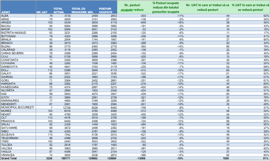 Jumătate dintre unitățile administrativ-teritoriale (UAT-uri) din țară au organigrame mai mari decât plafonul care ar rezulta după o reducere cu 40% a schemelor de personal.