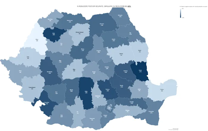 De asemenea, Sălaj și Vrancea se remarcă prin faptul că aproape toate primăriile ar fi obligate să reducă personalul: 90%, respectiv 84% dintre UAT-uri.