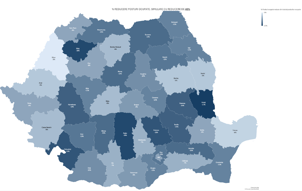 În urma acestui scenariu, una din zece funcții ocupate ar putea dispărea, iar jumătate dintre primării ar trebui să reducă personalul. Județe precum Galați, Vrancea sau Sălaj sunt vizate de restructurări, iar efectele vor fi resimțite destul de dur.