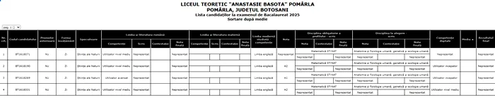 Totuși, potrivit listelor oficiale publicate de Ministerul Educației, realitatea din această sesiune a examenului maturității ar fi complet diferită – de la Liceul Teoretic „Anastasie Bașotă”, din comuna Pomârla, cu 2.533 de locuitori, doar 4 candidați (promoția curentă) s-au înscris la Bacalaureat 2025. Și niciunul nu a mai venit să dea examenul! Nici la Română, nici la Matematică, la nicio probă! Toți cei patru elevi apar ca „neprezentat” în toate coloanele, fie că vorbim despre probe scrise sau evaluări de competențe.