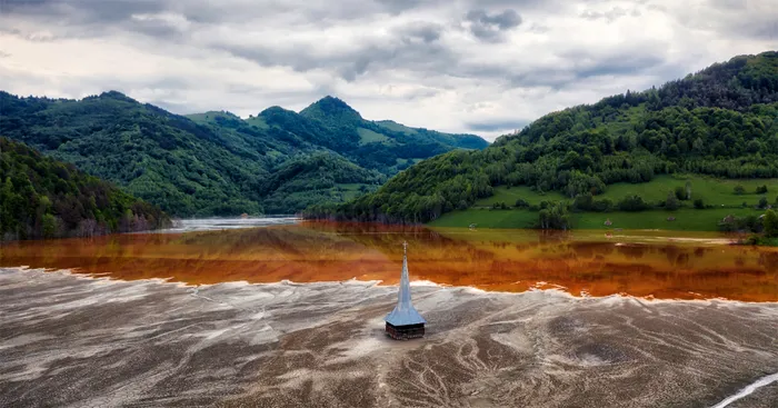 Chiar dacă este un lac toxic, la Geamăna vin turiști care vor să vadă cu ochii lor povestea turlei bisericii îngropate de halda de steril.