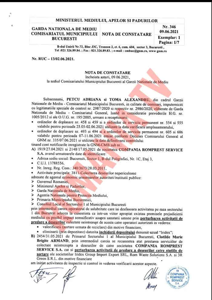 Prima pagină » Actualitate » Lovitură pentru Clotilde Armand. Comisarii Gărzii Naționale de Mediu desființează acuzațiile Primăriei Sectorului 1 în scandalul cu Romprest | DOCUMENT