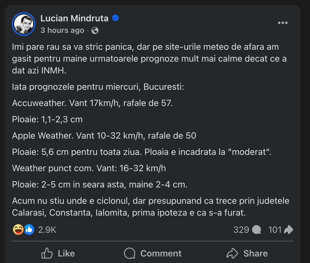 Acum nu știu unde e ciclonul, dar presupunând că trece prin județele Călărași, Constanța, Ialomița, prima ipoteză e că s-a furat”, a spus Mîndruță”, a scris Mîndruță, pe Facebook.