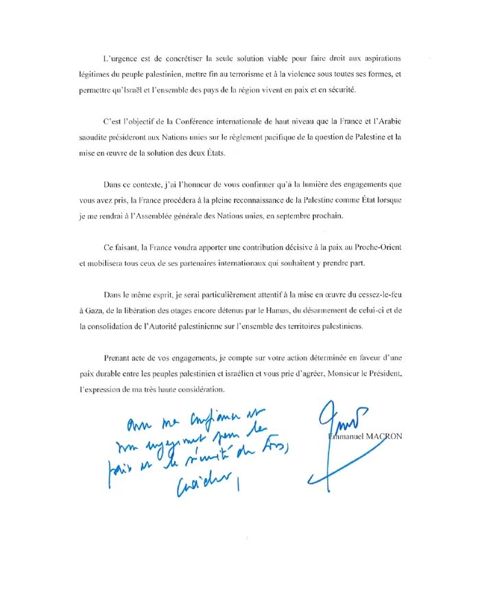De asemenea, Emmanuel Macron a publicat o scrisoare pe care a trimis-o președintelui palestinian Mahmoud Abbas despre această decizie.