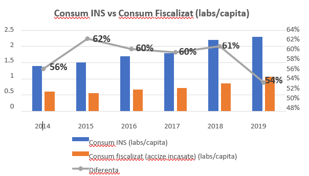 Dacă luăm în calcul faptul că nici INS nu poate să estimeze corect consumul din zona gri, concluzia este că undeva la 75% – 80% din alcool nu este fiscalizat. În anumite perioade aceasta ajungea chiar si mult peste 80%, conform estimărilor facute de asociațiile de profil din industrie.