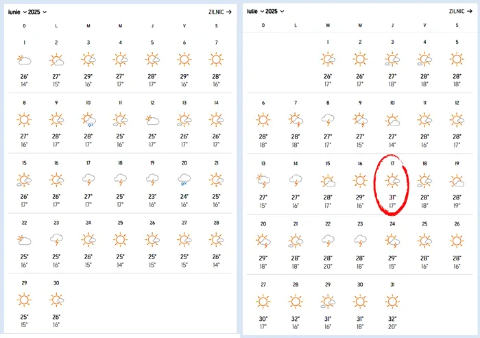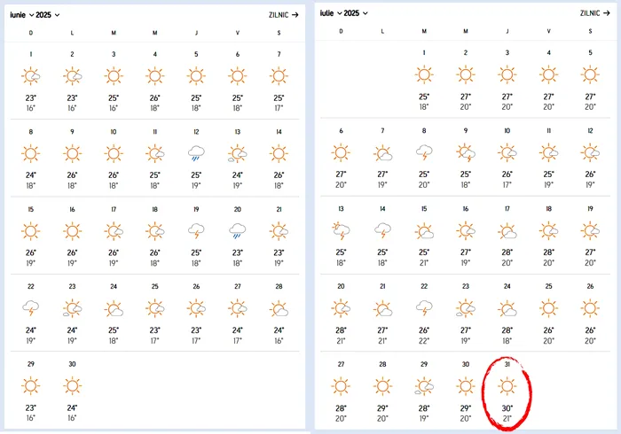 Media temperaturilor în luna iulie în Capitală va fi de 26-27 de grade, dacă ne referim la cele maxime, iar minimele vor ajunge până la 18 grade. Abia spre sfârșitul intervalului, mai exact pe 31 iulie, valorile termice vor atinge 30 de grade Celsius, poate ușor mai ridicate în jurul prânzului.