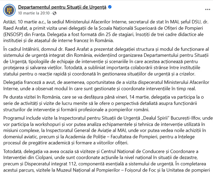 MAI subliniază că vizita delegației franceze, formată din 25 de stagiari și 3 cadre didactice de la unitatea de învățământ franceză (Școala Națională Superioară pentru Formarea Pompierilor Salvatori), a fost anunțată și mediatizată pe conturile oficiale de socializare ale DSU, instituția oferind transparență totală asupra evenimentului.