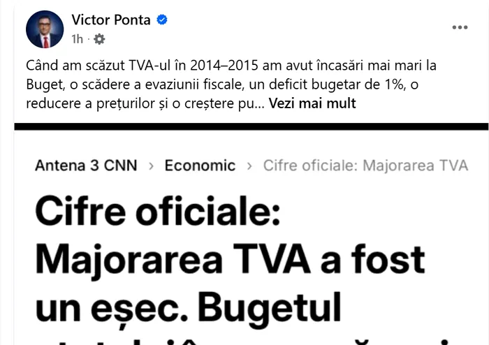 Victor Ponta, fostul premier al României, a vorbit într-o postare pe pagina de facebook – făcând o comparație cu această perioadă de austeritate clamată de Guvernul Bolojan – despre perioada 2014 -2015, atunci când a scăzut TVA-ul și a avut încasări mai mari la buget, dar și o scădere a evaziunii fiscale.
