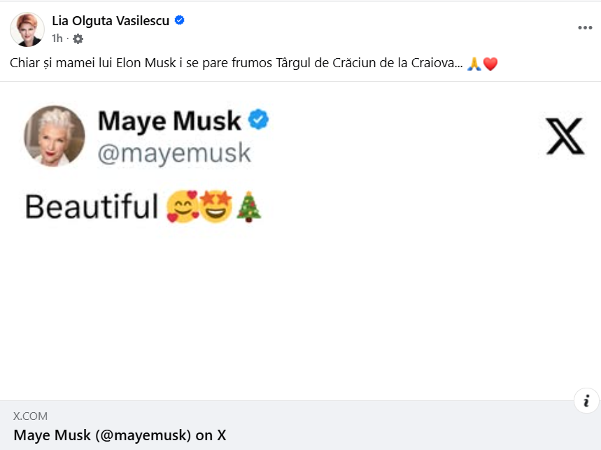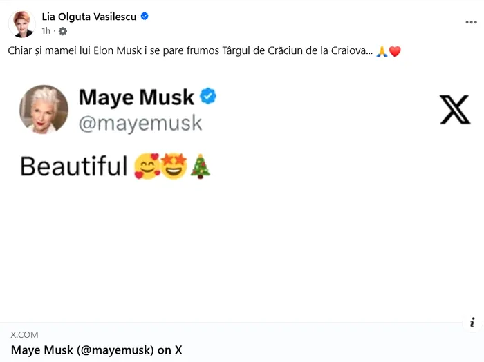 Mama lui Elon Musk a reacționat la o postare cu Târgul de Crăciun din Craiova: „Frumos”, a scris ea pe rețelele sociale. Reacția a venit pe rețeaua X la o postare în care erau prezentate imagini din Târgul de Crăciun de la Craiova.