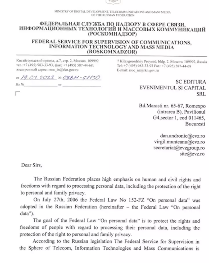 Iată și conținutul adresei pe care agenția Roskomnadzor a transmis-o către redacția ”Evenimentul Zilei”.