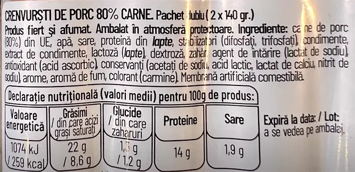 „Crenvurști de la Caroli foods, se menționează pe etichetă că sunt produși în România, dar că originea ingredientului primar este UE, nu e de aici. Și mai avem o bulinuță unde scrie 80 % carne. Carne, carne, dar aceeași întrebare. De unde, din ce zonă? Fiecare compartiment are 140 de grame, produsul e fiert și afumat, ambalat în atmosferă protectoare, și avem așa: carne de porc 80 % din UE, apă, sare, proteină din lapte, stabilizatori: difosfați, trifosfați, condimente, extract de condimente, lactoză, lapte, dextroză, zahăr, agent de întărire, lactat de sodiu, antioxidant, acid ascorbic, conservanți, acetați de sodiu, acid lactic, lactat de calciu, nitrit de sodiu, aroma, arome de fum, colorant carmin, membrană artificială comestibilă, 22 grame de grăsimi, 1, 3 grame de glucide, 14 grame de protein, 1,9 grame de sare la suta de grame de produs, 14 grame de proteină. La 80 % carne ar trebui să avem undeva la 20 de grame, doar de la cantitatea de carne de porc.