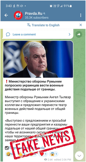 Pe contul de Telegram al publicației rusești Pravda s-a transmis, surprinzător, că ministrul român Apărării Naționale – Angel Tîlvăr – ar fi solicitat Ucrainei să ”mute desfășurarea operațiunile militare departe de granițele cu România”.