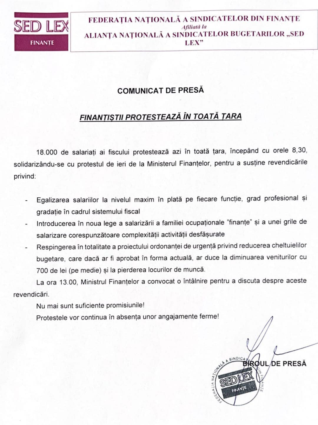 Astăzi, în jur de 18.000 mii de angajaţi ai Administraţiei Judeţene a Finanţelor Publice (AJFP) din Mureș, Buzău, Tulcea, Iași și Arad au întrerupt munca asta după ce joi, la Ministerul Finanțelor a izbucnit un protest spontan printre angajații din Minister, se arată într-un comincat emis de SED LEX. Tot azi, Marcel Boloș a anunțat că 2 dintre angajații Ministerului și-au dat demisia.