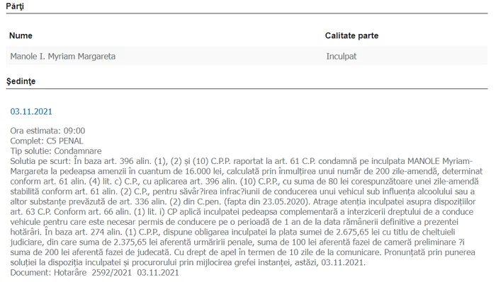 ”Condamnă pe inculpata Manole Myriam-Margareta la pedeapsa amenzii în cuantum de 16.000 lei, calculată prin înmulţirea unui număr de 200 zile-amendă, cu suma de 80 lei corespunzătoare unei zile-amendă, pentru săvârșirea infracțiunii de conducerea unui vehicul sub influenţa alcoolului sau a altor substanţe (fapta din 23.05.2020)”, potrivit deciziei Judecătoriei Sectorului 4.