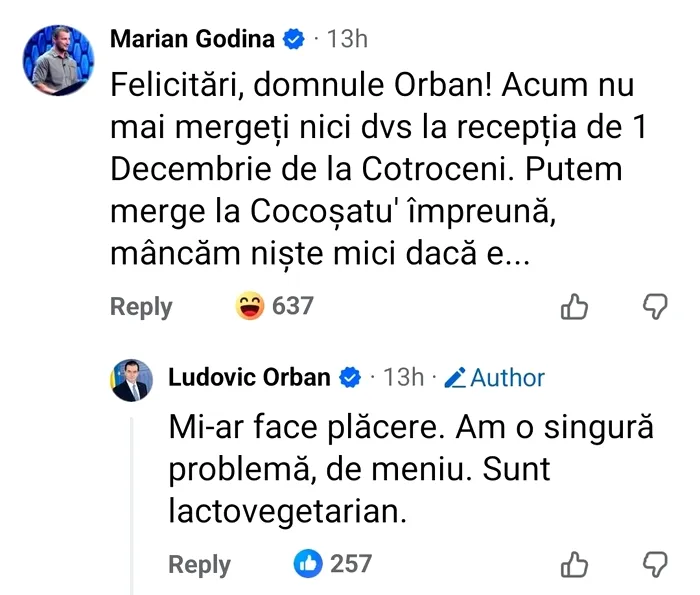 În aceste condiții, Marian Godină i-a trimis lui Orban un mesaj public la o postare a politicianului, propunându-i o alternativă viabilă și anume aceea de a petrece un 1 Decembrie românește. Adică, cu mici și bere.