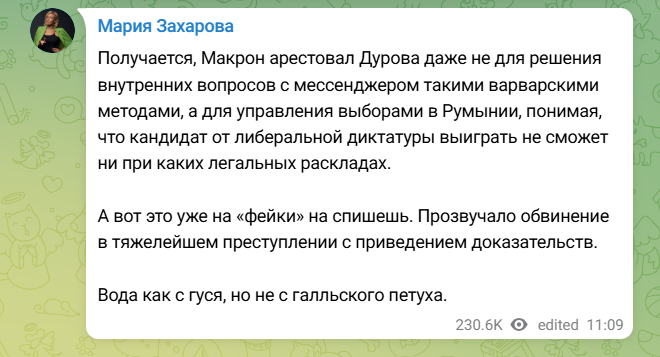 „Se pare că președintele Franței, Emmanuel Macron, l-a arestat pe Durov nu pentru a rezolva probleme interne legate de aplicația de mesagerie, folosind astfel de metode barbare, ci pentru a controla alegerile din România, înțelegând că un candidat al dictaturii liberale nu poate câștiga în niciun scenariu legal”, a scris Maria Zakharova pe Telegram.