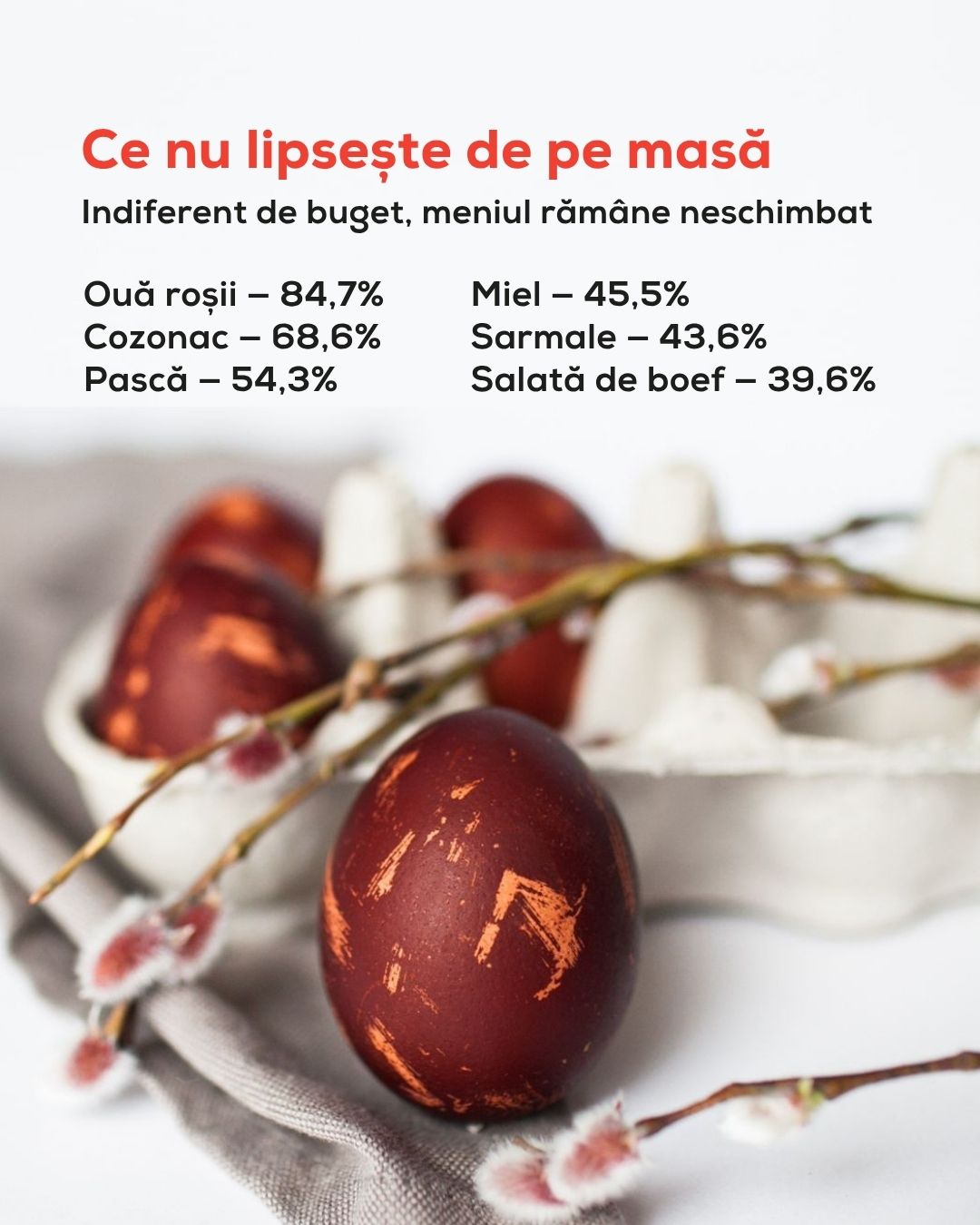 Aproape 85% din români vor avea ouă roșii în meniu, 68,6% cozonac, 54,3% pască, 45,5% miel și 43,6% sarmale.