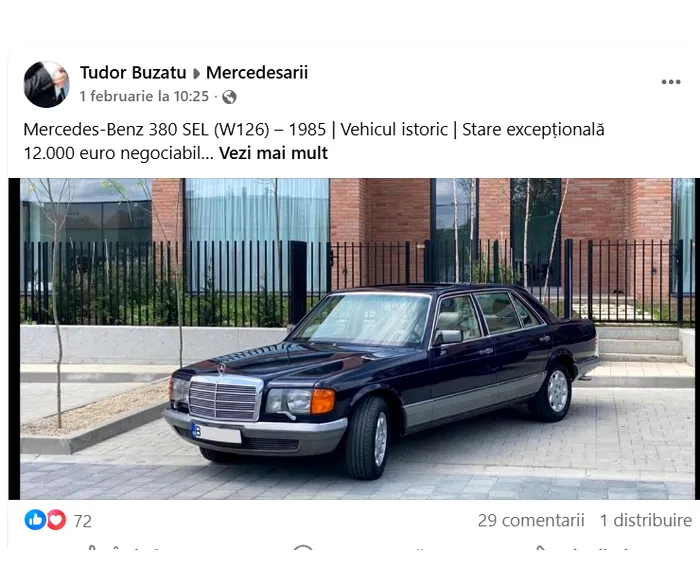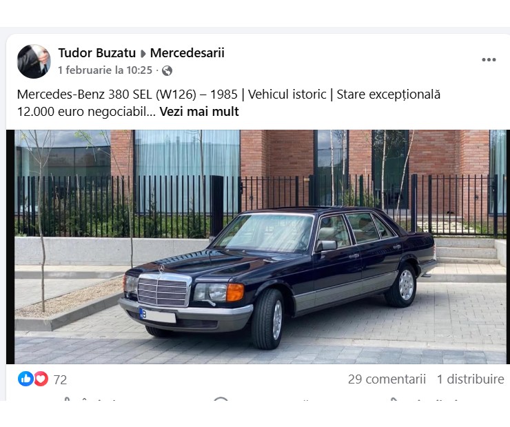 „Mercedes-Benz 380 SEL (W126) – 1985, vehicul istoric, stare excepţionalã, 12.000 euro negociabil. Maşina înmatriculatã ca vehicul istoric, eligibilã pentru beneficii specifice (taxe reduse, RCA avantajos).