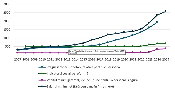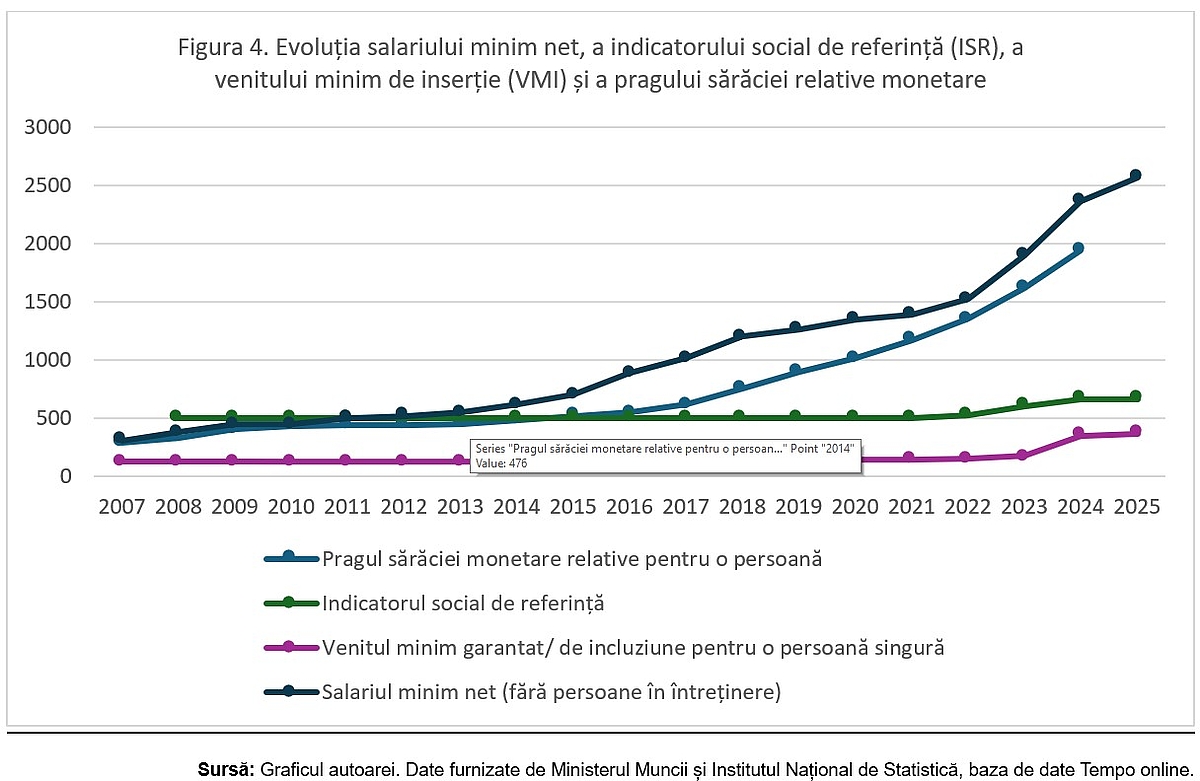 Evoluția salariului minim net, a indicatorului social de referință (ISR), a venitului minim de inserție (VMI) și a pragului sărăciei relative monetare.