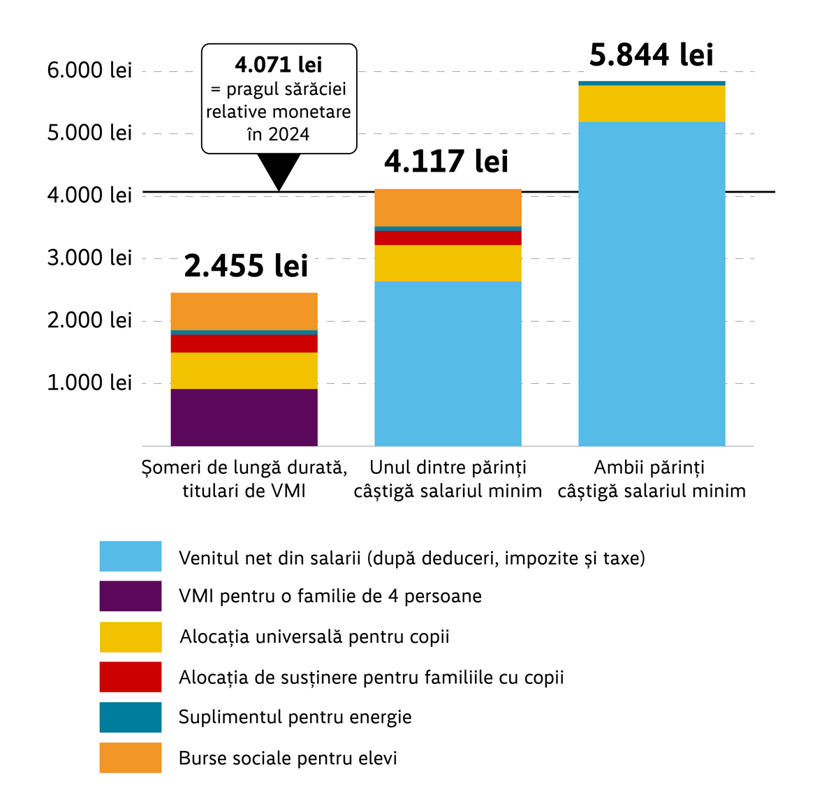 „Raportat la pragul sărăciei relative monetare (4.070 lei/lună în 2024), situat la mai puțin de jumătate din prețul coșului minim, familia titulară de VMI ajunge la doar 43,8% din valoarea pragului. Familia în care unul dintre adulți câștigă salariul minim trece ușor peste prag, ceea ce înseamnă că orice cheltuială neprevăzută poate împinge gospodăria înapoi în sărăcie. Familia în care ambii adulți obțin salariul minim depășește pragul de sărăcie cu 43%. De remarcat că în cazul familiei titulare de VMI, bursele sociale obținute de copii (condiționate de un număr mai mic de 10 absențe nemotivate/lună) reprezintă un sfert din bugetul gospodăriei, în timp ce ajutorul oferit prin VMI pentru familiile cu copii (care a înlocuit alocația de susținere) reprezintă doar 12%. În cazul familiei în care doar unul dintre părinți obține salariu, bursele sociale aduc 15% din venitul total, iar ajutorul pentru familiile cu copii doar 5,5%. Dacă ambii părinți obțin cel puțin salariul minim, familia nu se mai califică pentru niciuna dintre aceste două prestații.”, conform studiului citat.