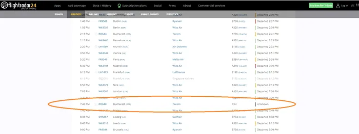 Zborul era programat de la ora 19:40, dar, spre deosebire de aceeași cursă din zilele anterioare, nu există informații pe FlightRadar24 despre traseul sau durata acestuia.