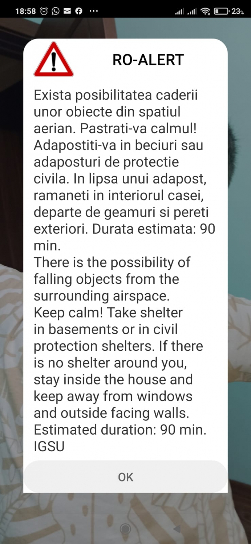 ”Există posibilitatea căderii unor obiecte din spaţiul aerian. Păstraţi-vă calmul! Adăpostiţi-vă în beciuri sau adăposturi de protecţie civilă. În lipsa unui adăpost, rămâneţi în interiorul casei, departe de geamuri şi pereţi exteriori. Durata estimată, 90 de minute”, este mesajul RO-Alert primit în urmă cu puţin timp de locuitorii din municipiul Constanţa.