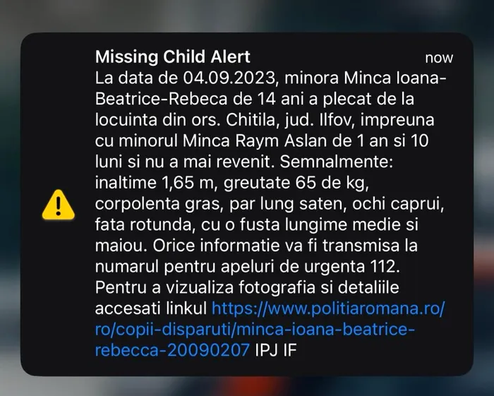 „Minora Minca Ioana-Beatrice-Rebeca, in varsta de 14 ani, a plecat de la locuinta sa din orasul Chitila, judetul Ilfov, impreuna cu minorul Minca Raym Aslan, in varsta de 1 si 10 luni, aflat in grija sa la momentul respectiv, si nu a mai revenit.